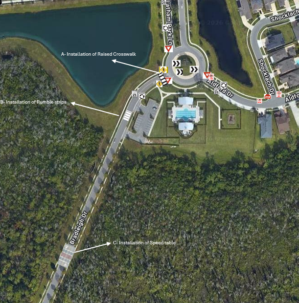 Following a recent traffic evaluation on Bradleigh Dr conducted by Orange County, results show that traffic volume and speeds meet Orange County criteria for traffic calming measures. To improve safety, especially for families, children, and pedestrians traveling to and from the community pool and surrounding areas, the following plan will be installed beginning April 6th, 2026: